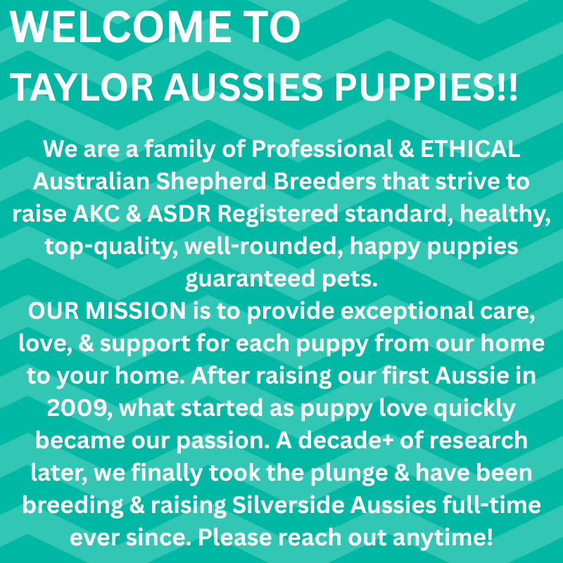 Disclaimer: All puppies are considered available until payment has been received. If you’re hoping to reserve a puppy that’s currently listed as available, it’s always possible that someone else may be inquiring about the same pup. Please keep in mind that we do not hold puppies, therefore you should be ready to move forward & pay the deposit upon approval. You are more than welcome to prepay your deposit to HOLD YOUR PLACE IN LINE, as we will not accept your payment unless we think you would be a good fit for a TAYLOR AUSSIE!!! 😁
